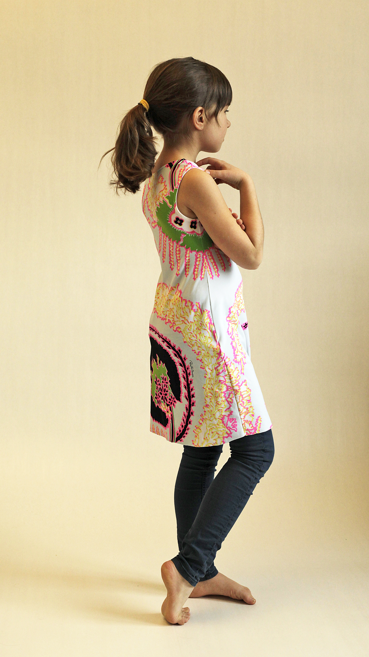 I chose denim to keep the everyday look & feel. Got excited and sewed a small jacket as well, to keep the girl warmer. After all, we can seldom wear sleeveless dresses in Finland without any extra coverage.