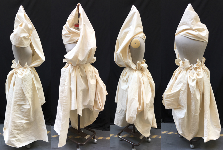 Muokkasimme kalikosta, sellaisesta paksuhkosta puuvillaisesta lakanakankaasta erilaisia muotoja nuken ylle.